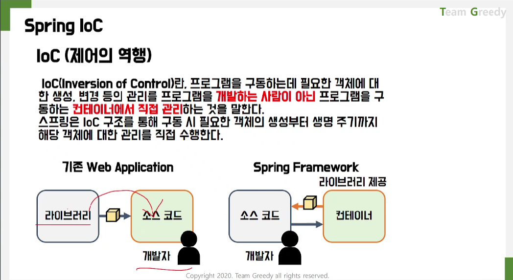 IoC Container - 제어의 역전: 개발자가 주도하는게 아니라 프레임워크 안에서 관리를 수행한다.