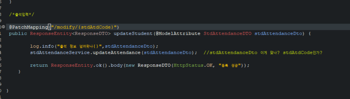 입력한 출석정보가 넘어가야하는데 계속 500 에러가 뜨는 것이다.
